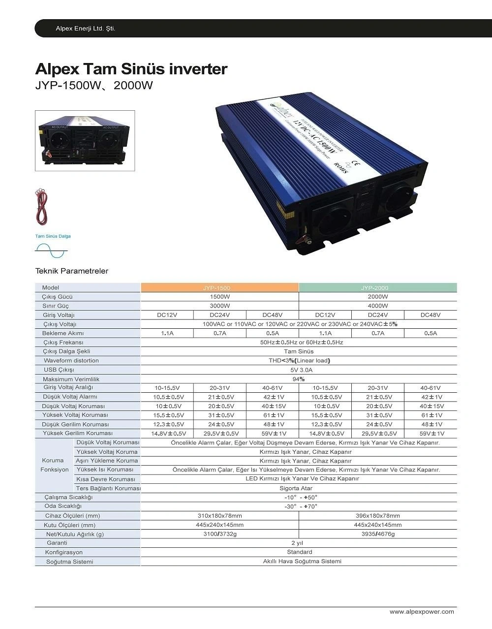 Alpex’in 1500 W 24 V Tam Sinüs İnverter, evdeki şebeke elektriğine eşdeğer temiz ve kararlı sinüs dalgası çıkışı sağlar. Motor, klima, buzdolabı gibi yüksek güçlü cihazlarla kullanım için ideal olan bu inverter, güvenilir performans sunar.