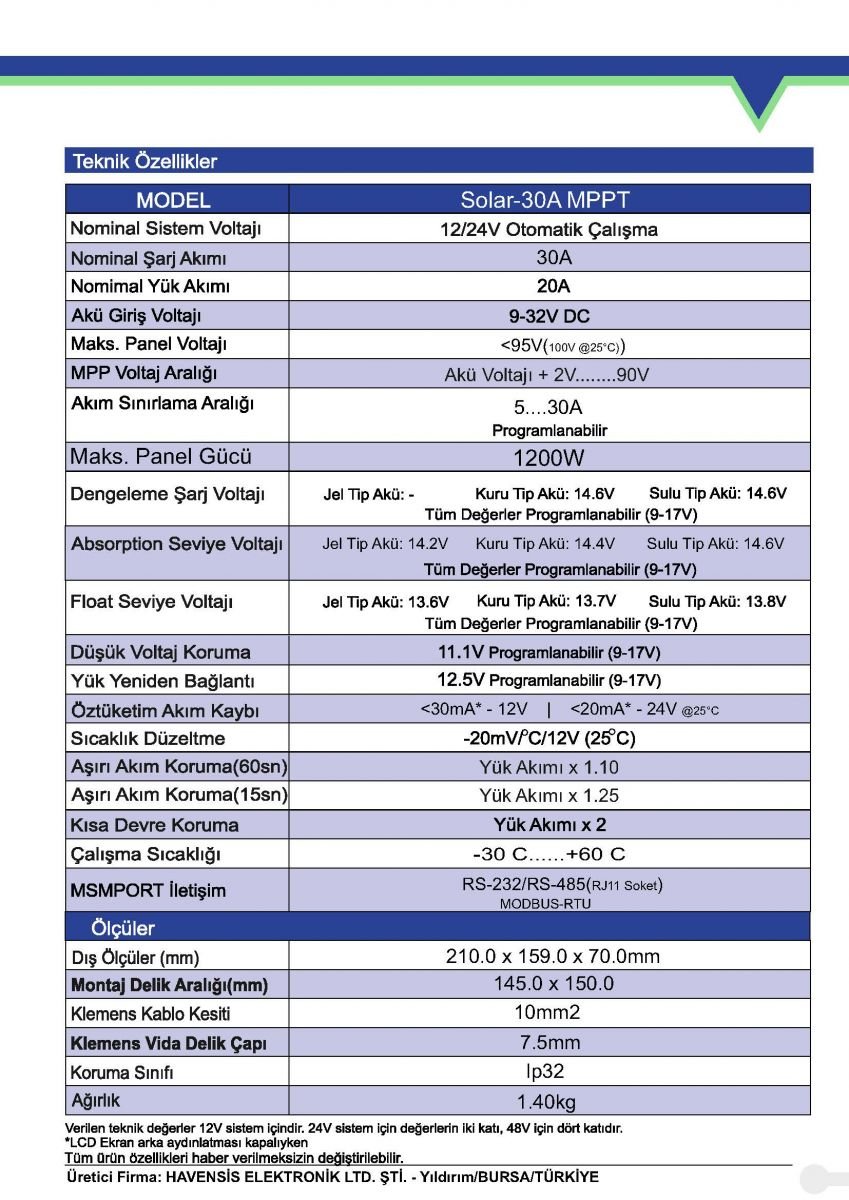 30A MPPT Solar Şarj Kontrol Havensis