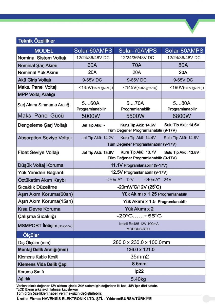 60/70/80A MPPT Solar Şarj Kontrol Havensis